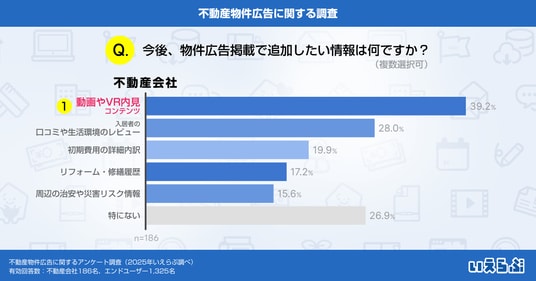 不動産会社に「今後、物件広告掲載で追加したい情報は何ですか?」と質問したところ、「動画やVR内見コンテンツ」(39.2%)が最も多く、続いて「入居者の口コミや生活環境のレビュー」(28.0%)という結果となりました。