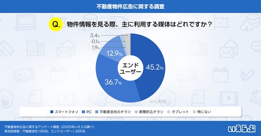 エンドユーザーに物件情報を見る際に利用する媒体を尋ねたところ、「スマートフォン」(45.2%)、「PC」(36.7%)が多い結果となりました。一方で、チラシを利用するユーザーも一定数いることがわかります。