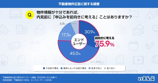 また、エンドユーザーの中には、物件情報が十分であれば内見前に「申込みを前向きに考える」可能性が高いことも分かりました。こうしたことから、エンドユーザーの関心に沿った情報を提供しつつ、情報の相違が生じないよう工夫することの重要性がうかがえます。
