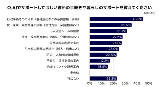 とりわけ期待の高い分野は「役所の手続きのガイド(45.3%)」が最多で、「税・保険・年金関連の説明(35.6%)」「ごみ分別ルールの確認(31.7%)」が続きました。
