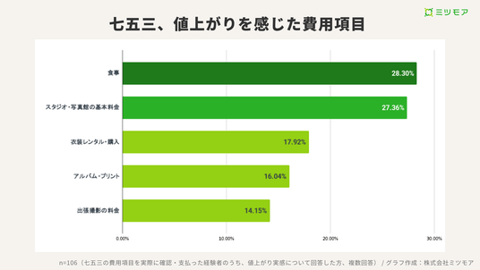 「お祝い食事代」(28.3%)と「スタジオ・写真館の基本料金」(27.4%)が僅差で上位となり、いずれも約3割の親が値上がりを実感。七五三の「主役」である衣装(17.9%)を大きく上回る結果となりました。
