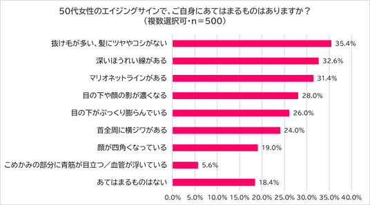 今度は、50代の女性に「50代女性のエイジングの特徴であてはまるものはあるか?」と尋ねたところ、最も多かったのが 「抜け毛が多い、髪にツヤやコシがない」(35.4%) でした。さらに、「深いほうれい線」(32.6%)や「マリオネットライン」(31.4%)も高く、40代よりもシワやたるみが“深刻化”していることが分かりました。また、「目の下や顔の影が濃くなる」(28.0%)や「目の下がぷっくり膨らんでいる」(26.0%)、「顔が四角くなっている」(19.0%)など、たるみによる陰影や輪郭の変化を感じている人も増えていることが分かりました。