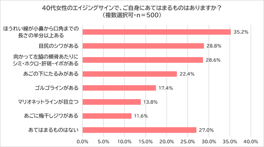 40代の女性に「40代女性のエイジングの特徴であてはまるものはあるか?」と尋ねたところ、 「ほうれい線が小鼻から口角までの長さの半分以上ある」(35.2%) が最多でした。以下、「目尻のシワがある」(28.8%)、「向かって左脇の頬骨あたりにシミ・ホクロ・肝斑・イボがある」(28.6%)と続き、「あごの下のたるみがある」(22.4%)や「ゴルゴラインがある」(17.4%)といった顔の下部に現れる変化も目立ち始める傾向が見られました。一方で、4人に1人以上(27.0%)の女性が「あてはまるものはない」と答えました。