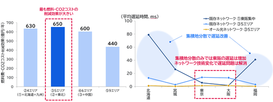 2040年時点の集積地分散による燃料費等のコスト削減効果(左図)とネットワーク技術変化による平均遅延時間の変化(右図)