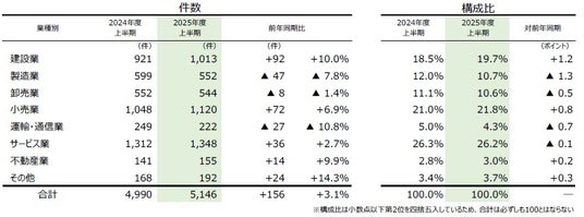 業種別にみると、7業種中4業種で前年を上回った。『サービス業』(前年同期1312件→1348件、2.7%増)が8半期連続で増加し、2000年度以降で最多となった。『小売業』(同1048件→1120件、6.9%増)は過去3番目に多かった。『建設業』(同921件→1013件、10.0%増)は、上半期としては2013年度(1204件)以来12年ぶりに1000件を上回った。『不動産業』(同141件→155件、9.9%増)は、2024年度下半期(155件)と並び、過去10年で最多タイとなった。