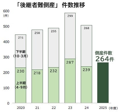「後継者難倒産」は、264件(前年同期239件、10.5%増)判明し、2年ぶりに前年同期を上回った。上半期としては2023年度(287件)に次いで過去2番目となり、高水準で推移した。業種別では、『建設業』(65件)が最も多く、『製造業』(47件)、『サービス業』(43件)、『小売業』(39件)が続いた。