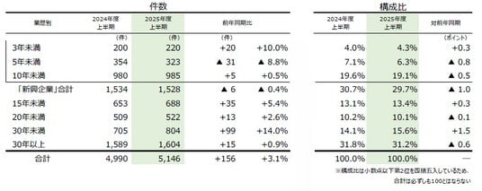 業歴10年未満の『新興企業』〈「3年未満」(前年同期200件→220件、10.0%増)、「5年未満」(同354件→323件、8.8%減)、「10年未満」(同980件→985件、0.5%増)〉は1528件(前年同期1534件、0.4%減)と、上半期としては4年ぶりに前年を下回ったものの、2024年度に次ぎ過去3番目に多かった。内訳を業種別にみると、「サービス業」(同516件→508件、1.6%減)が最も多く、「小売業」(同391件→354件、9.5%減)、「建設業」(同272件→319件、17.3%増)が続いた。