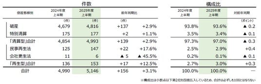 倒産態様別にみると、『清算型』倒産の合計は4993件(前年同期4854件、2.9%増)となり、全体の97.0%を占めた。『再生型』倒産は153件(同136件、12.5%増)発生し、上半期としては4年連続で前年を上回った。