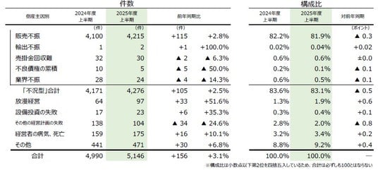 主因別にみると、「販売不振」が4215件(前年同期4100件、2.8%増)で最も多く、上半期としては2年連続で4000件を上回った。「売掛金回収難」(前年同期32件→30件、6.3%減)や「不良債権の累積」(同10件→5件、50.0%減)などを含めた『不況型倒産』の合計は4276件(同4171件、2.5%増)で、8半期連続で増加した。