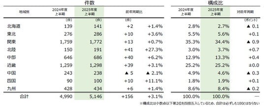 地域別にみると、9地域中8地域で前年を上回った。最も件数が多かったのは、『関東』(前年同期1759件→1772件、0.7%増)で、「東京」(同905件→886件)を除く全県で前年を上回った。『九州』(同428件→434件、1.4%増)は、上半期としては2009年度(499件)に次ぎ、過去3番目に多かった。『四国』(同90件→100件、11.1%増)は、上半期としては2011年度(110件)以来14年ぶりに100件を上回った。