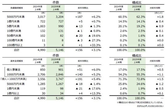 負債額を規模別にみると、「5000万円未満」が3204件(前年同期3017件、6.2%増)となり、2000年度以降で最多となった。「5000万円以上1億円未満」の倒産も727件(同722件、0.7%増)と上半期としては過去10年で最多となり、中小零細規模の倒産が増加した。