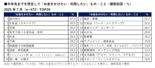 - 半年先までを想定して「お金をかけたい・利用したい」もの・ことを聞いたところ、1位は「国内旅行」47.3%だった。なお、「海外旅行」は10.5%で20位以内には入らなかった。