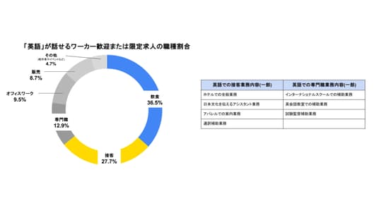募集が出た求人の職種割合は飲食・接客・専門職の順に高くなっています(※6)。接客の中には、ホテルでの業務が多いほか、海外からきたお客様に日本文化を伝えるアシスタント業務など珍しい求人も見受けられました。タイミーを通じて、英語を活用し、自身のスキルを活かしながら働ける業務の幅が増えていることがうかがえます。