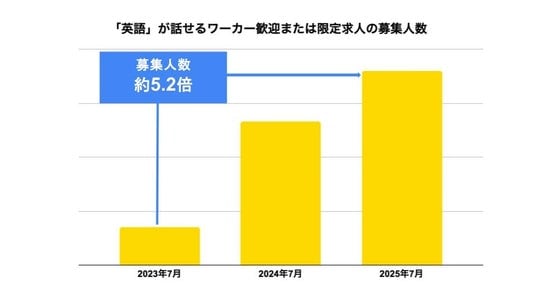 - 2023年7月と2025年7月の「英語」が話せるワーカー歓迎または限定の募集人数を比較すると約5.2倍に。