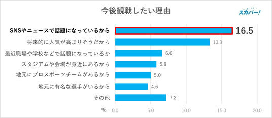 2位のスポーツは「高校野球(約8.7%)」でした。大会の開催時期には全国的にも話題になる高校野球ですが、地元や出身地の高校の活躍やSNSでの話題などをもとに、現地や配信で観戦してみたいと感じる人が多いということが推測されます。