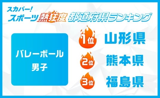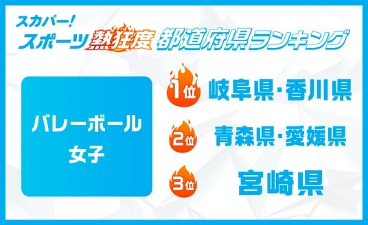 男子バレーボールは、1位山形県、2位熊本県、3位福島県という結果に。女子バレーボールでは、1位岐阜県、香川県、2位青森県、愛媛県、3位宮崎県という結果になりました。男子バレーボール1位の山形県は「頻度」「発信」「費用」の3項目で平均以上の数値となり、総合的に熱狂していることがわかりました。女子バレーボール1位の岐阜県ではVリーグに所属するJAぎふリオレーナの存在などが熱狂の要因だと考えられます。