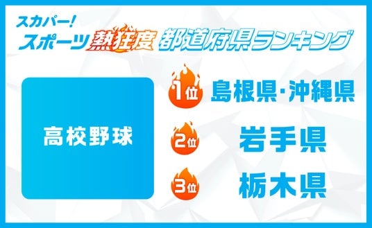 1位島根県、沖縄県、2位岩手県、3位栃木県という結果になりました。島根県は昨年の甲子園において、島根県代表校の躍進、沖縄県は今年の甲子園において沖縄県代表校が優勝するなど、地域密着性や甲子園常連校の存在が影響していると考えられます。両県ともに、「発信」における数値が高く、また沖縄県で高校野球を選択した人の観戦する理由では「そのスポーツで感動することが多いから(約73.3%)」と地元の高校の活躍における熱狂度が伺えます。