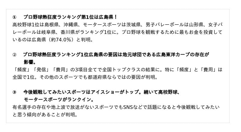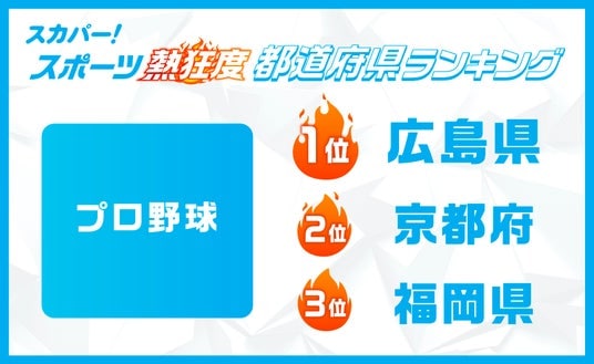 1位広島県、2位京都府、3位福岡県という結果になりました。広島県は地元球団の広島東洋カープの存在や地上波やローカル紙などでの露出が多く、視聴体験だけでなくファンになる導線が日常的に多いことが要因だと考えられます。「費用」「発信」「頻度」の3項目全て高水準で、観戦する理由としても「地元にプロスポーツチームがあるから(約56.8%)」や「地元で試合が開催されるから(約38.6%)」と“カープ熱”が後押しした結果となりました。