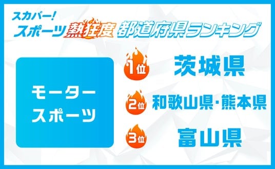 1位茨城県、2位和歌山県、熊本県、3位富山県という結果になりました。茨城県には筑波サーキットがあり、よりモータースポーツを身近に感じることができる環境が要因だと考えられます。また、近年のモータースポーツの人気向上から、「スカパー! スポーツ熱狂度ランキング2025」でも1位に輝くなど、注目が集まっているスポーツです。