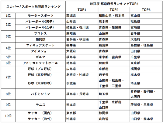 モータースポーツは茨城県、プロレスは高知県が1位に