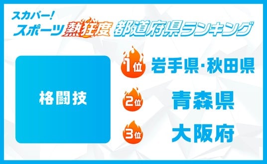 プロレスは、1位高知県、2位山梨県、3位岩手県という結果になりました。格闘技では1位岩手県、秋田県、2位青森県、3位大阪府という結果になりました。プロレスで1位となった高知県では昨今人気急上昇中の女子プロレスの大会『STARDOM in KOCHI 2025』が開催されるなど、有名選手の参加などが要因だと考えられます。格闘技1位の岩手県では八重樫 東さんをはじめとする多くの世界王者を輩出するなど、有名選手が多いことも要因だと考えられます。