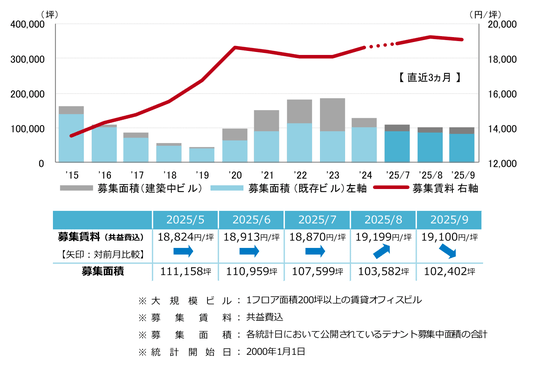 募集賃料は前月比マイナス99円/坪の19,100円/坪となった。前月から下落したものの小幅な動きに止まり、19,000円/坪台で推移している。