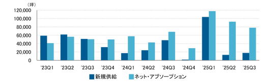 ネット・アブソープション(吸収需要)はオフィス需要の指標であり、一定期間におけるテナント入居面積(稼働面積)の増減を表す。直近2025年第3四半期の吸収需要は約8万坪の高水準となった。需要が新規供給を上回る需要超過は、8期連続となっている。
