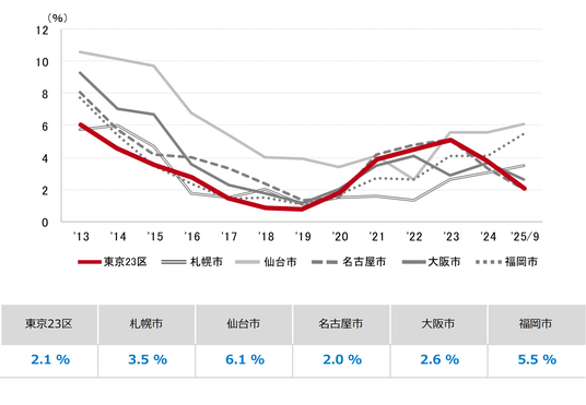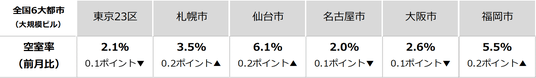 三幸エステート株式会社(本社:東京都中央区、取締役社長:福島正二郎)は、2025年9月度の東京都心5区(千代田区、中央区、港区、新宿区、渋谷区)および全国6大都市(東京、札幌、仙台、名古屋、大阪、福岡)の大規模ビル※1のマーケットデータをまとめた「オフィスマーケット2025年10月号」を公表します。