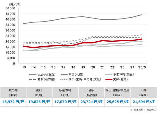 三幸エステート株式会社(本社:東京都中央区、取締役社長:福島正二郎)は、2025年9月度の福岡市オフィス賃貸状況(空室率&現空面積:全規模、募集賃料&募集面積:全規模、規模別空室率、主要エリア※1空室率:全規模)および全国6大都市(東京・札幌・仙台・名古屋・大阪・福岡)の大規模ビルのマーケットデータをまとめた「オフィスマーケット2025年10月号福岡」を公表します。