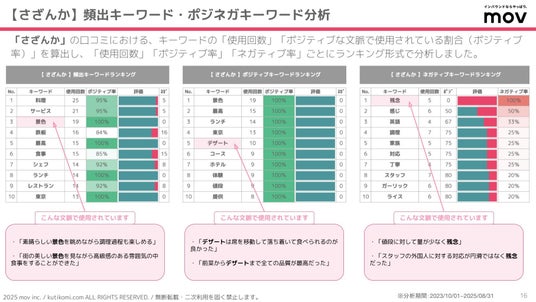 こちらの表では「さざんか」の口コミにおける、キーワードの「使用回数」「ポジティブな文脈で使用されている割合(ポジティブ率)」を算出し、「使用回数」「ポジティブ率」「ネガティブ率」ごとにランキング形式で分析しました。