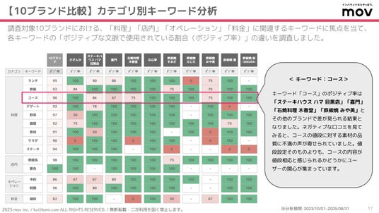キーワード「コース」のポジティブ率は「ステーキハウス ハマ 目黒店」「嘉門」「石焼料理 木春堂」「鉄板焼 みや美」とその他のブランドで差が見られる結果となりました。ネガティブな口コミを見てみると、コースの値段に対する素材の品質に不満の声が寄せられていました。値段設定そのものよりも、コースの内容が値段相応と感じられるかどうかにユーザーの関心が集まっています。