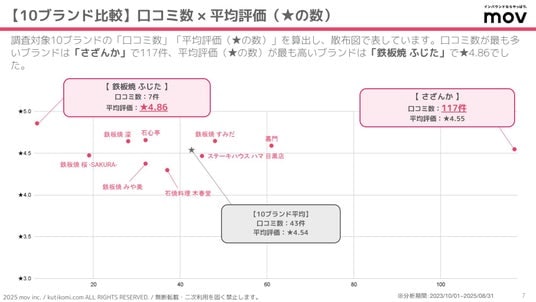 こちらの散布図では、調査対象10ブランドの「口コミ数」「平均評価(★の数)」を算出しています。口コミ数が最も多いブランドは「さざんか」で117件、平均評価(★の数)が最も高いブランドは「鉄板焼 ふじた」で★4.86でした。