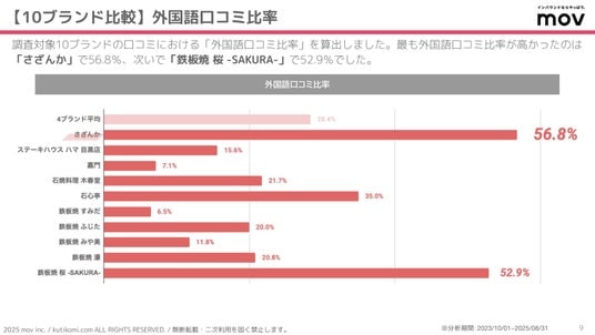 こちらのグラフでは、調査対象10ブランドの口コミにおける「外国語口コミ比率」を算出しています。最も外国語口コミ比率が高かったのは「さざんか」で56.8%、次いで「鉄板焼 桜 -SAKURA-」で52.9%でした。