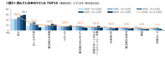 読んでいる本のジャンルは「小説」が5割、「単行本マンガ」「趣味系の専門書」が2割前後。