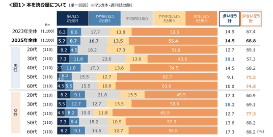 読む量が「多いほう」と思っている人は男女とも30代が高いものの、いずれも2割未満。一方、男性50~60代と女性40代は「少ないほう」の割合が7割半ば。<図1>