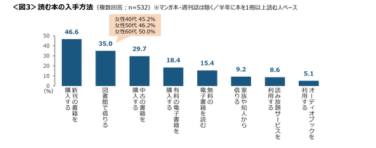 「有料の電子書籍を購入する」「無料の電子書籍を読む」はいずれも1割台。女性40~60代は「図書館で借りる」が4~5割で、特に女性50~60代では最も多い入手方法。<図3>