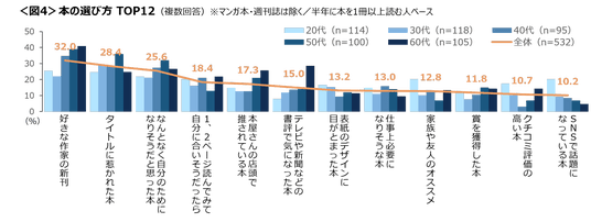 20代は「SNSで話題」、50~60代は「好きな作家」、60代は「テレビや新聞などの書評で気になった本」をきっかけに本を選択している。<図4>
