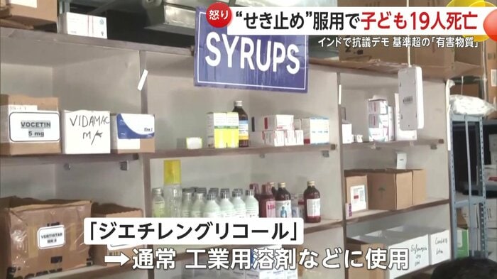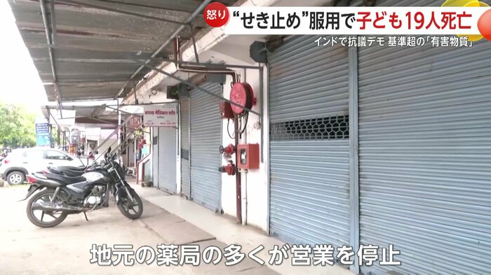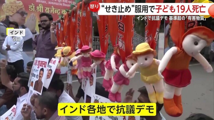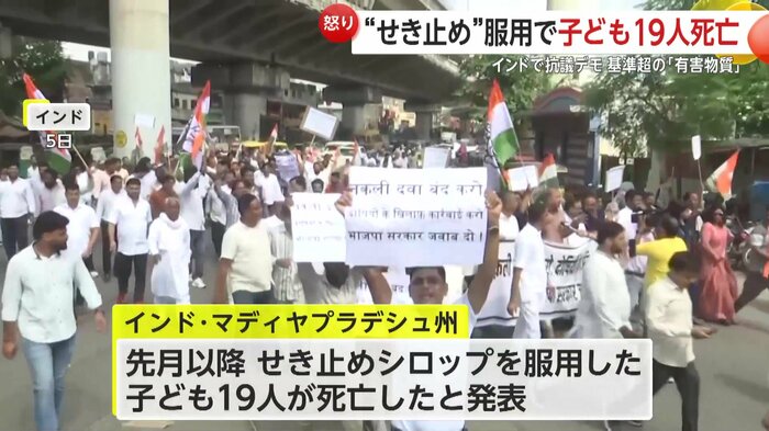 インドで咳止めシロップを服用した子供19人が死亡したことを受け、各地で抗議デモが行われた。シロップには有害な化学物質が含まれていたことが判明。当局は問題の製品を保管していた倉庫を封鎖、薬局の多くを営業停止とした。