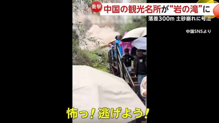 山肌が崩れ、岩が滝のように次々と降り注ぎ、白い噴煙となって観光客を襲った。。