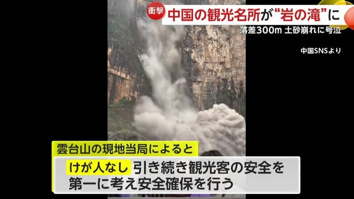現場となった雲台山の観光地当局によると、最近降り続いた強い雨の影響で5日午後3時前、滝の景観を望む場所から300メートルの地点で落石が発生したが、けが人はいなかったという。