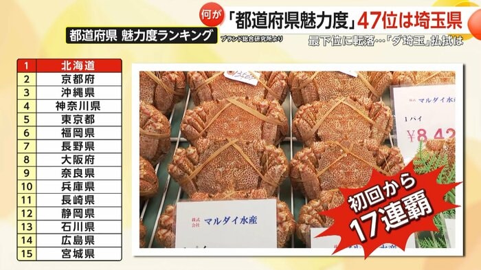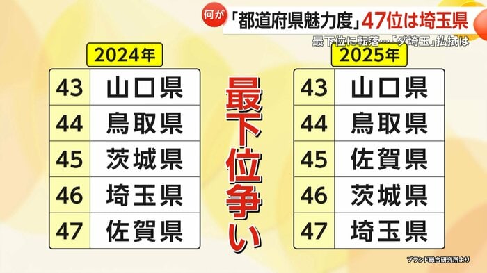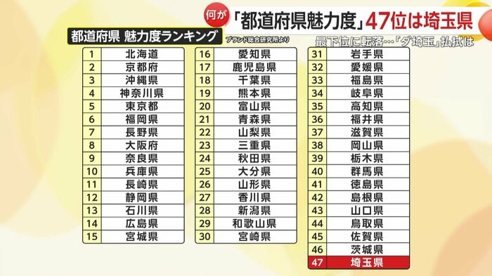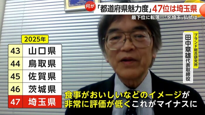 2025年の都道府県魅力度ランキングで、埼玉県が初めて全国最下位となった。「食事がおいしい」という評価が特に低く、順位を下げた可能性があるという。