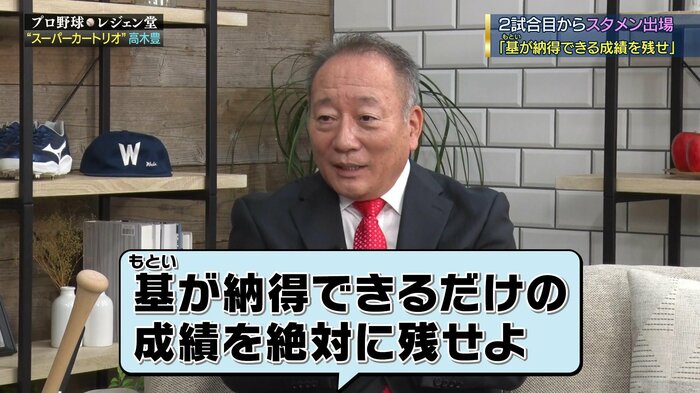 もうグレようかなと思ってたら、次の日、関根さんが後ろに来て、「豊、これから129試合、お前は全部スタメンで使う」と、セカンドで。「開幕はちょっと基に譲ってもらった」と。「だけどおまえ、基が納得できるだけの成績を絶対残せよ」って言われて。「分かりました」と。