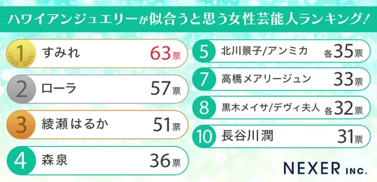 今回の調査で、ハワイアンジュエリーが似合う女性芸能人ランキングの1位は、「すみれ」さんでした。