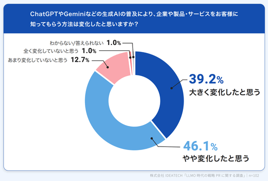 実際に、当社が企業のマーケティング担当者に行った調査では、85.3%もの担当者が「生成AIの普及により、企業や製品・サービスの認知経路が変化した」と実感していることが明らかになりました。