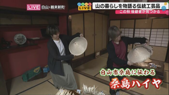 檜細工保存会(準備中)代表の新田美佐さんは「私の嫁ぎ先の桑島には、ヒノキ笠を使って民謡を踊るハイヤという踊りがある。ヒノキ細工を守ることによって他の伝統や文化も守られるというつながりが大事だと思った」と話す。2人に桑島ハイヤを踊ってもらうと、一つ一つの仕草がとても美しかった。