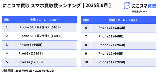 2025年9月の販売数ランキングでは、iPhone SE(第3世代)(64GB)が4か月連続で1位にランクインしました。