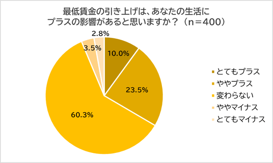 今度は、「最低賃金の引き上げは、あなたの生活にプラスの影響があると思うか?」と尋ねました。「とてもプラス」(10.0%)、「ややプラス」(23.5%)と答えた人33.5%に対し、「変わらない」は60.3%と最多でした。また、「ややマイナス」(3.5%)、「とてもマイナス」(2.8%)と答えた人も6.3%いました。この結果から、多くの生活者が賃上げによる生活改善を実感できていないことがわかりました。