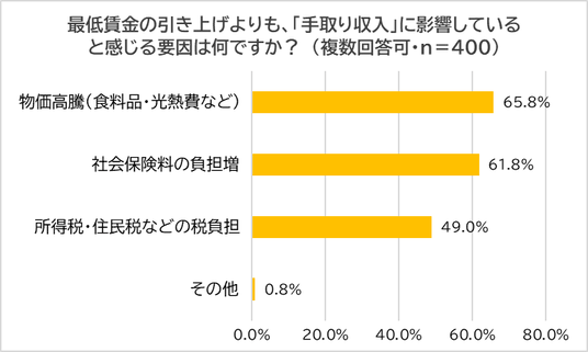 さらに、「最低賃金の引き上げよりも「手取り収入」に影響していると感じる要因は何か?」と尋ねたところ、最も多かったのは「物価高騰(食料品・光熱費など)」(65.8%)、次いで「社会保険料の負担増」(61.8%)、「所得税・住民税などの税負担」(49.0%)でした。