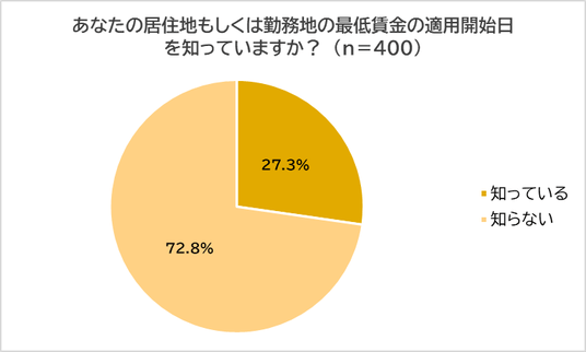 続いて、「あなたの居住地もしくは勤務地の最低賃金の適用開始日を知っているか?」尋ねたところ、「知っている」はわずか27.3%、72.8%が「知らない」と回答しました。