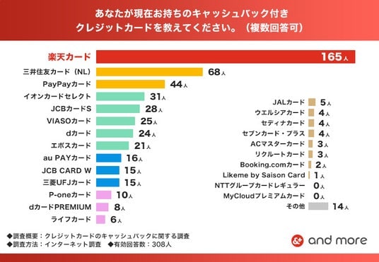 - キャッシュバック付クレジットカード保有ランキング、1位は『楽天カード』(165人)、2位『三井住友カード(NL)』(68人)、3位『PayPayカード』(44人)